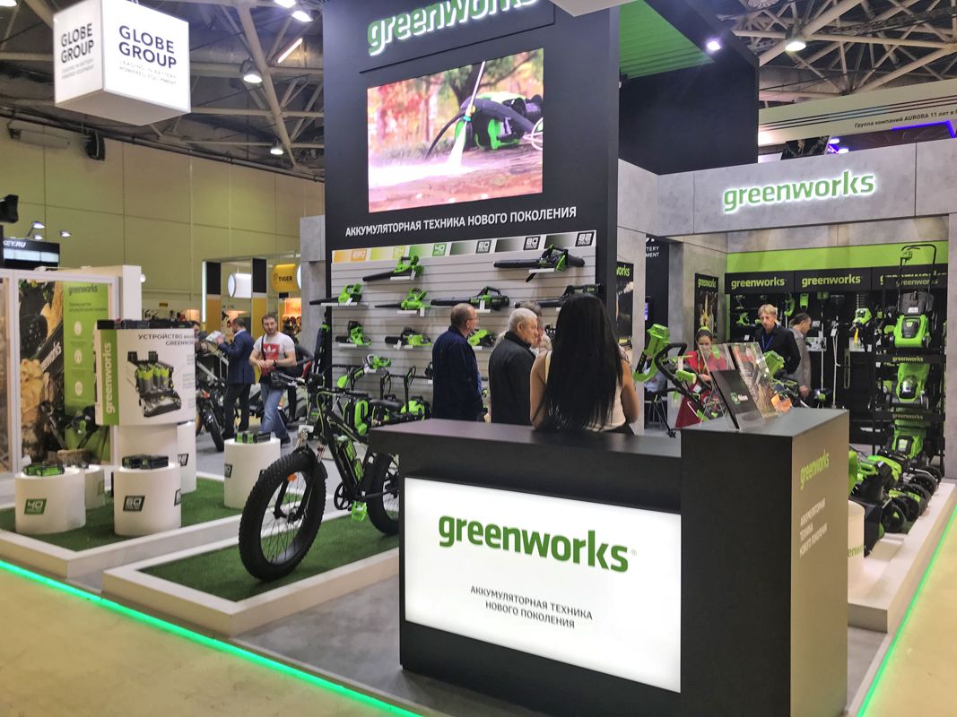 На верхнем уровне расположились серьёзные игроки российского и европейского рынков. Один из центральных стендов занимала Компания Greenworks. На нашем стенде можно было ознакомиться практически со всем основным ассортиментом продукции.